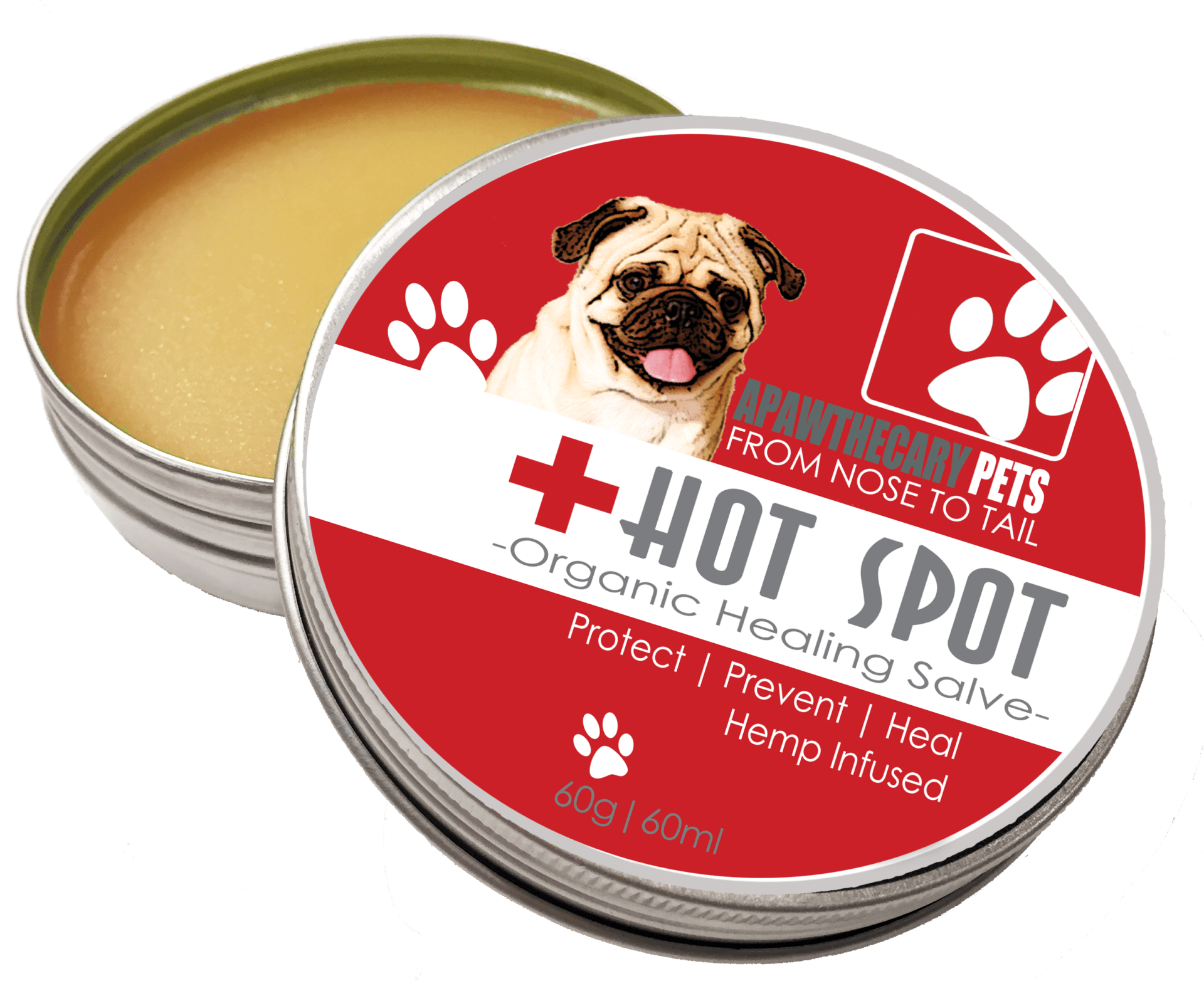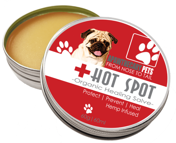 Hot Spot Salve by Apawthecary Pets 100% all-natural organic salve Specifically formulated to treat your pet’s hot spots Hot spots are essentially an immune-mediated response of the skin. They appear as red, moist, irritated, sometimes oozy skin lesions. Hot spots also tend to appear suddenly, with no warning. If you see one on your dog, it’s important to start treating it right away. Ingredients: Hemp Oil, Coconut Oil, Chamomile Oil, Calendula Oil, Beeswax, Hemp Terpenes, Hypericum (St. John’s Wort), Vitamin E, Rosemary Essential Oil, Rosemary Extract.