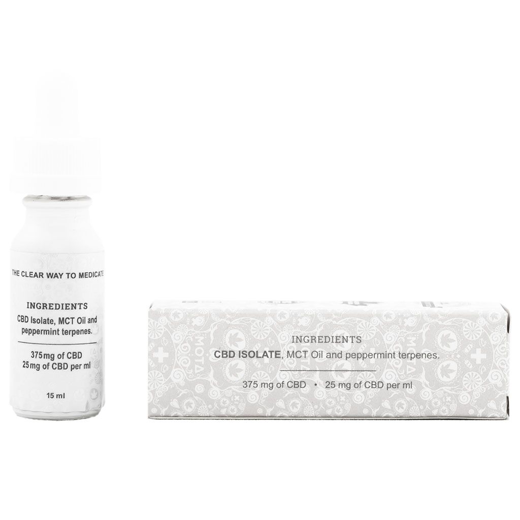 CBD isolate, MCT oil, and peppermint terpenes. 25mg of CBD per 1ml dropper