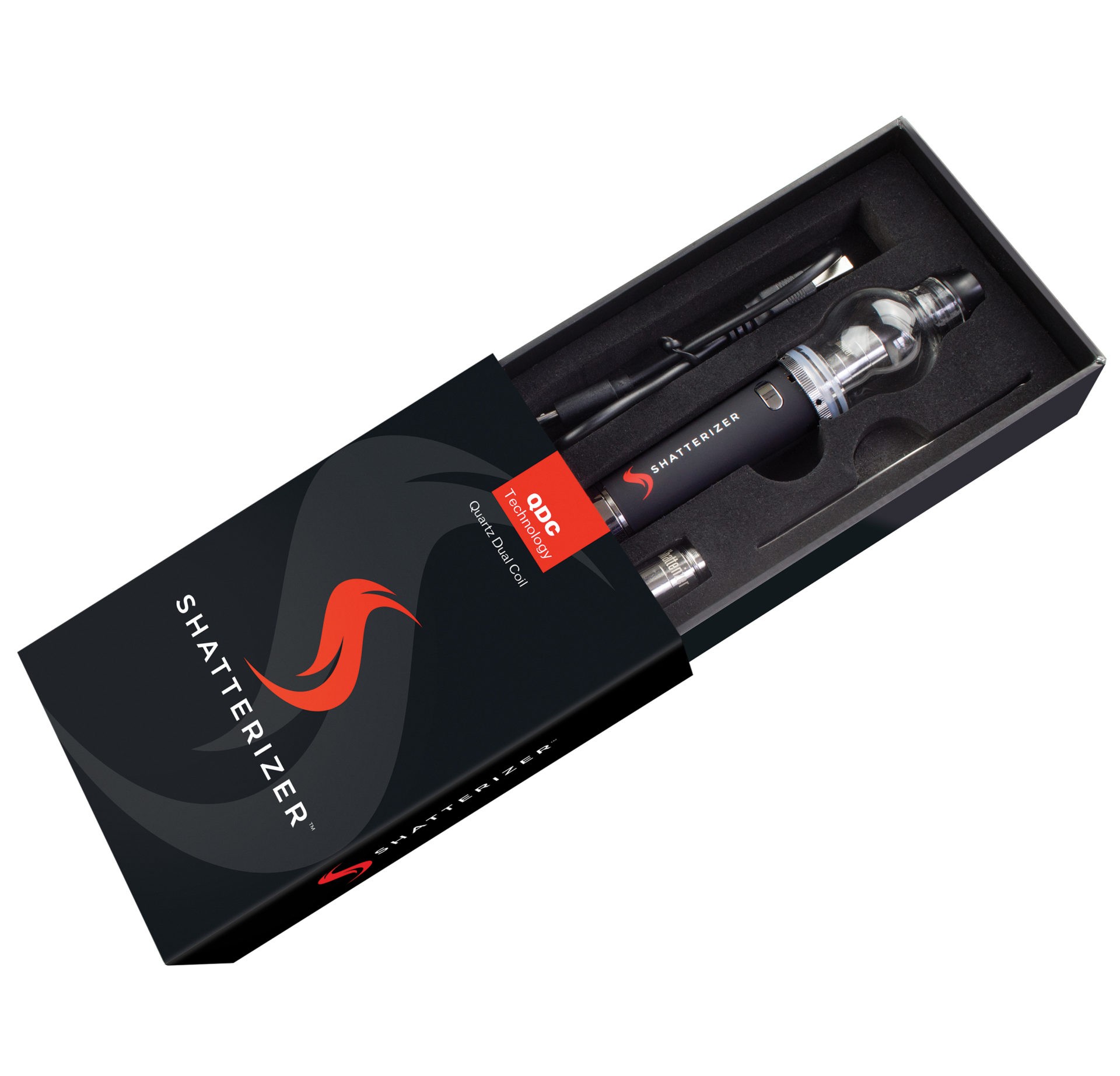 1 Shatterizer Atomizer: resin cover mouthpiece, borosilicate glass and Quartz Dual Coil (QDC) and cap and one additional QDC coil